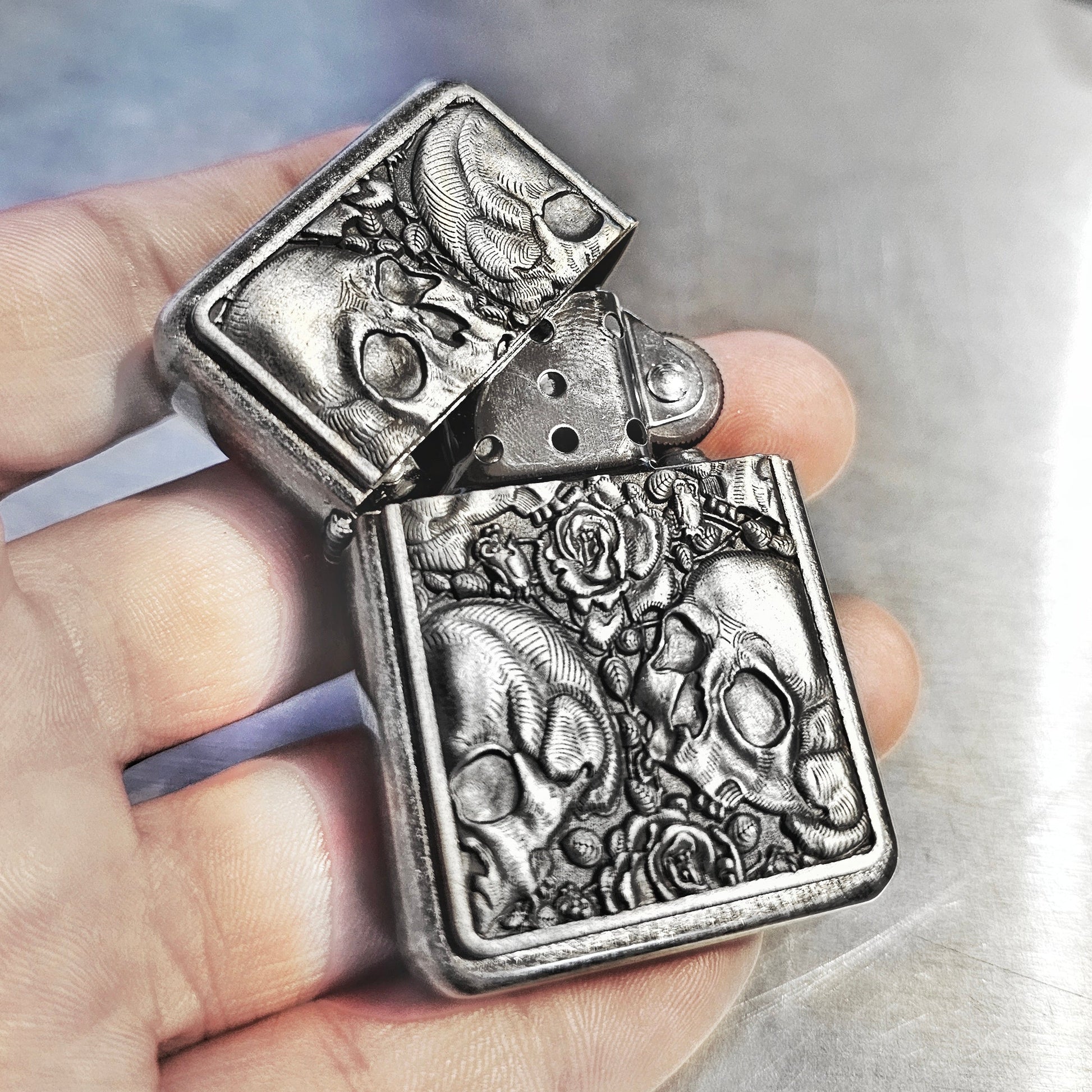 Bringen Sie mühelos Licht in Ihr Leben mit unserem schwarzen Crackle Skulls And Roses Flip-Feuerzeug! Mit einem atemberaubenden Design aus Totenköpfen und Rosen auf einer glatten schwarzen Oberfläche ist dieses Feuerzeug nicht nur praktisch, sondern verleiht auch einen Hauch von ausgefallenem Stil. Nie wieder ein langweiliges Feuerzeug und setzen Sie mit jedem Gebrauch ein Statement.