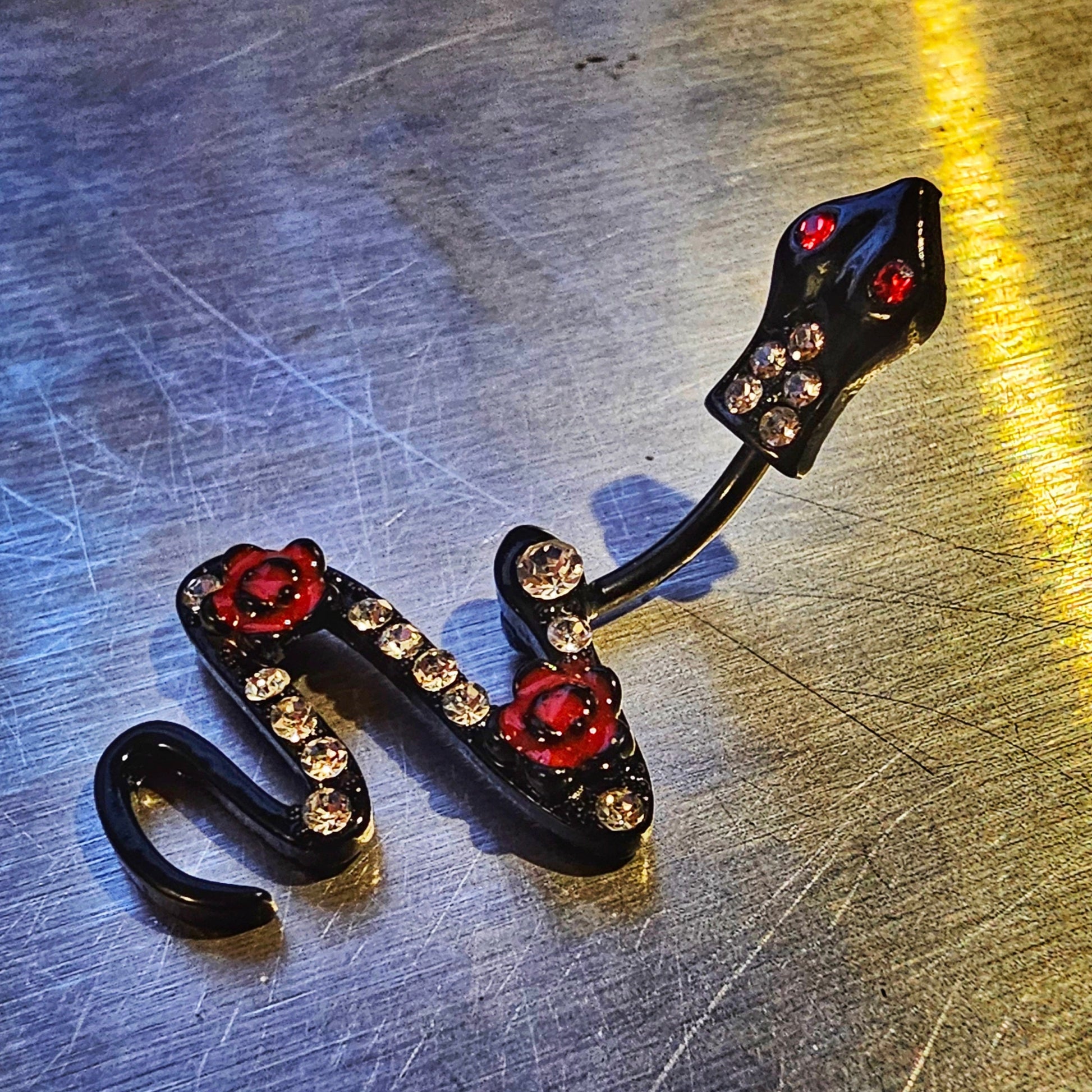 Rehaussez votre style avec notre piercing de nombril en forme de serpent noir et rouge ! Cette superbe pièce présente un design noir élégant et un rouge vif, parfait pour faire une déclaration audacieuse. Avec sa forme de ventre de serpent unique, vous vous démarquerez dans n'importe quelle foule et vous vous sentirez confiant et puissant. Améliorez votre collection de bijoux de nombril dès aujourd'hui !