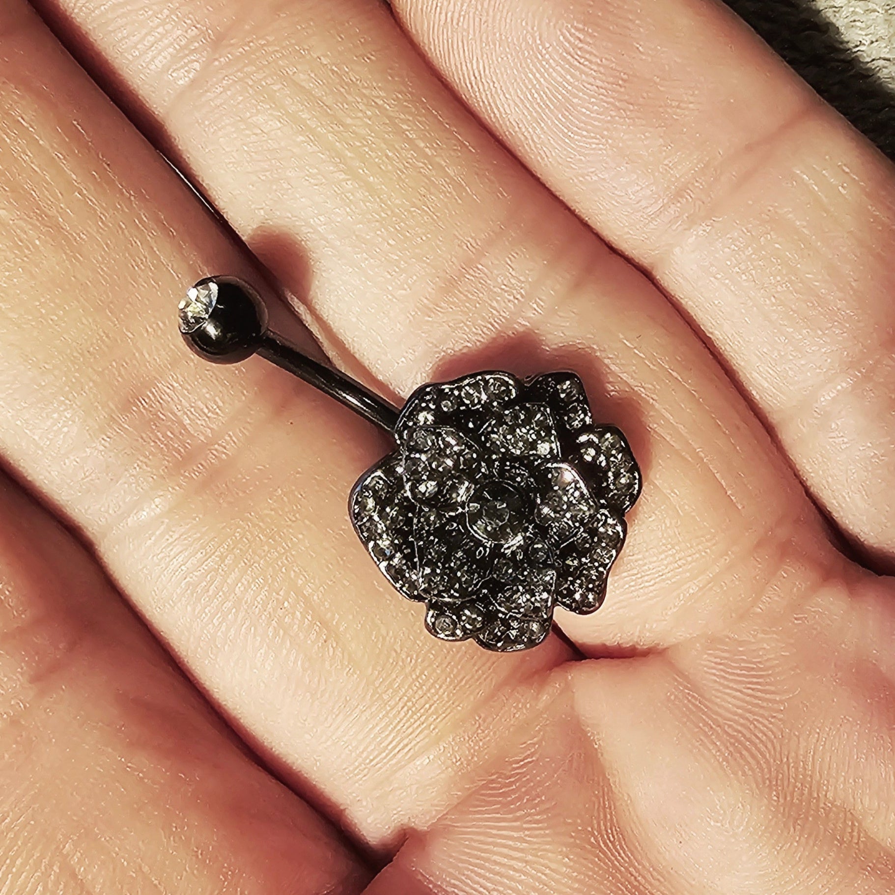 Piercing nombril en cristal noir avec fleur de rose 14G