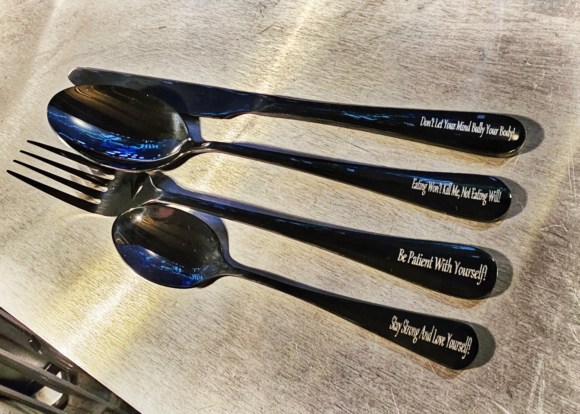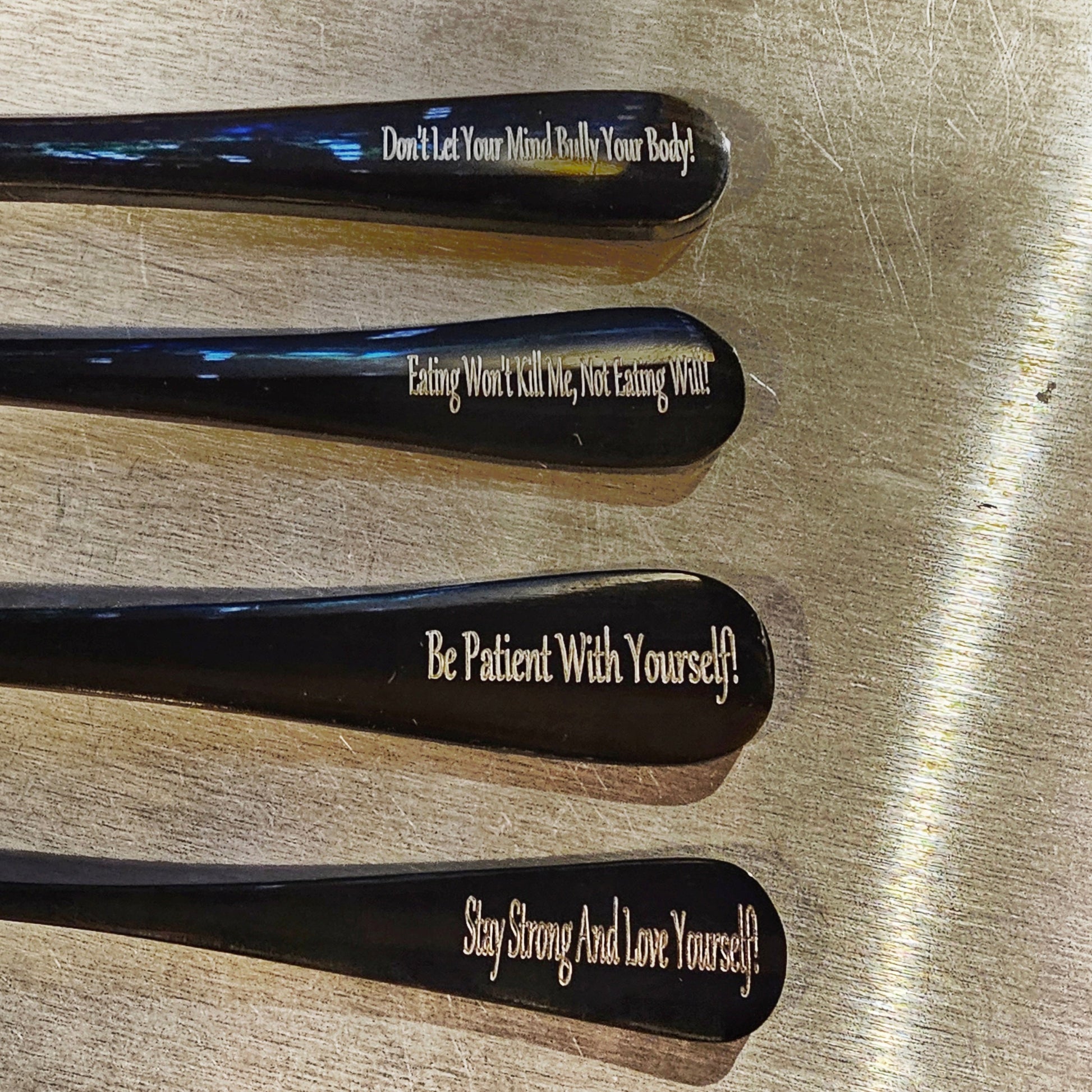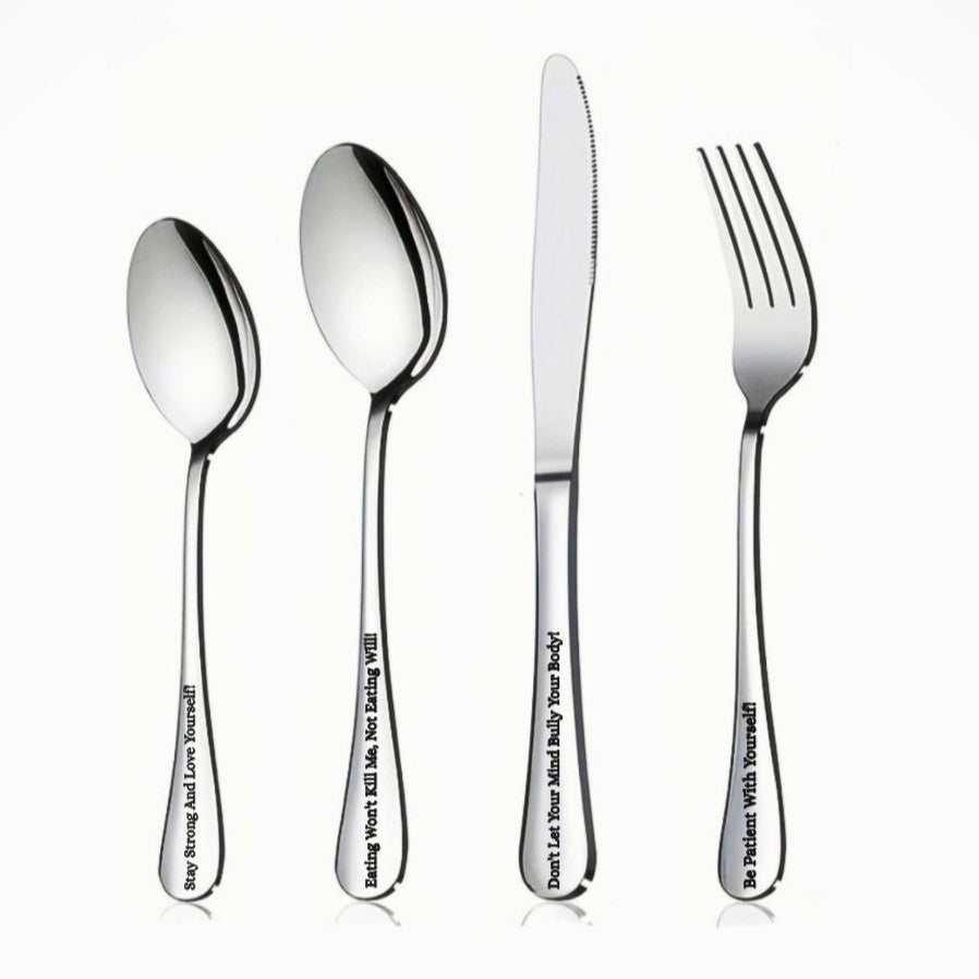 Motivez-vous et montrez votre soutien à la santé mentale avec notre ensemble de couverts Positive en acier inoxydable de 4 pièces. Chaque pièce est personnalisée et gravée de messages inspirants, rendant les repas amusants et réconfortants. Un cadeau parfait pour ceux qui luttent contre les troubles de l'alimentation, répandant la positivité à chaque bouchée !