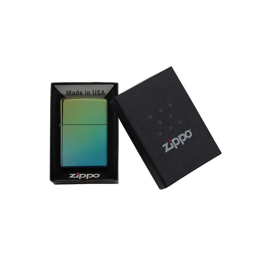 A new mesmerising model is joining the High Polish finish line. The new High Polish Teal model morphs into tropical yellow-lime tones and deep Caribbean turquoise as the light catches and plays along this mirror-like finish. Comes packaged in a gift box. For optimal performance, fill with Zippo lighter fuel.